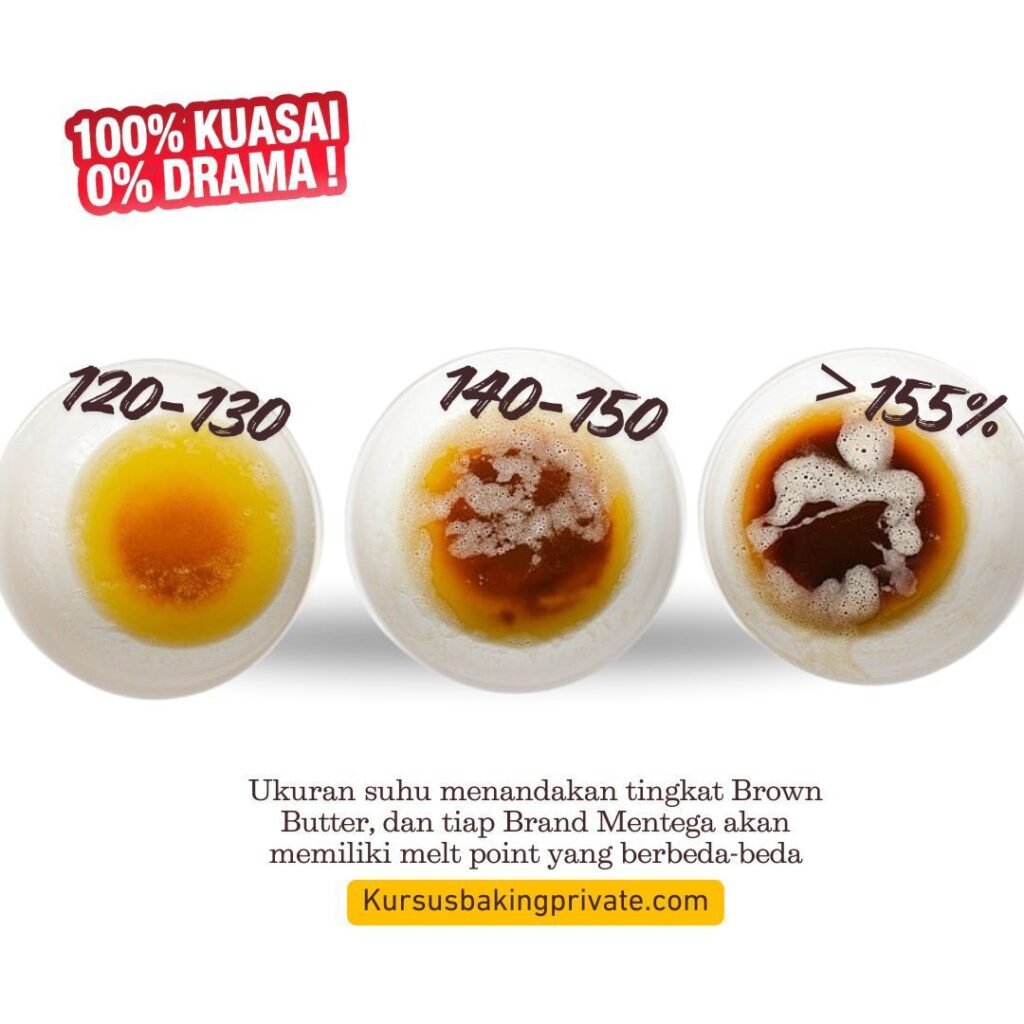 – Di atas 155 Derajad, Mentega berisiko tinggi menjadi gosong (burnt butter). Padatan susu akan berubah menjadi hitam dan memberikan rasa pahit yang merusak masakan.